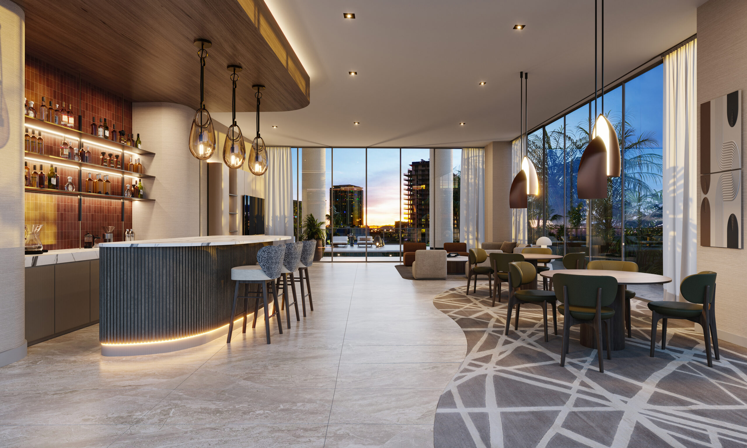 El desarrollo cuenta con 55 pisos y 592 residencias, con opciones de Studios, 1 y 2 habitaciones, todas completamente amuebladas y decoradas con muebles a medida. El diseño arquitectónico, a cargo de la reconocida firma Kobi Karp, destaca por su estructura cóncava con líneas horizontales prominentes, creando una fachada visualmente impactante.